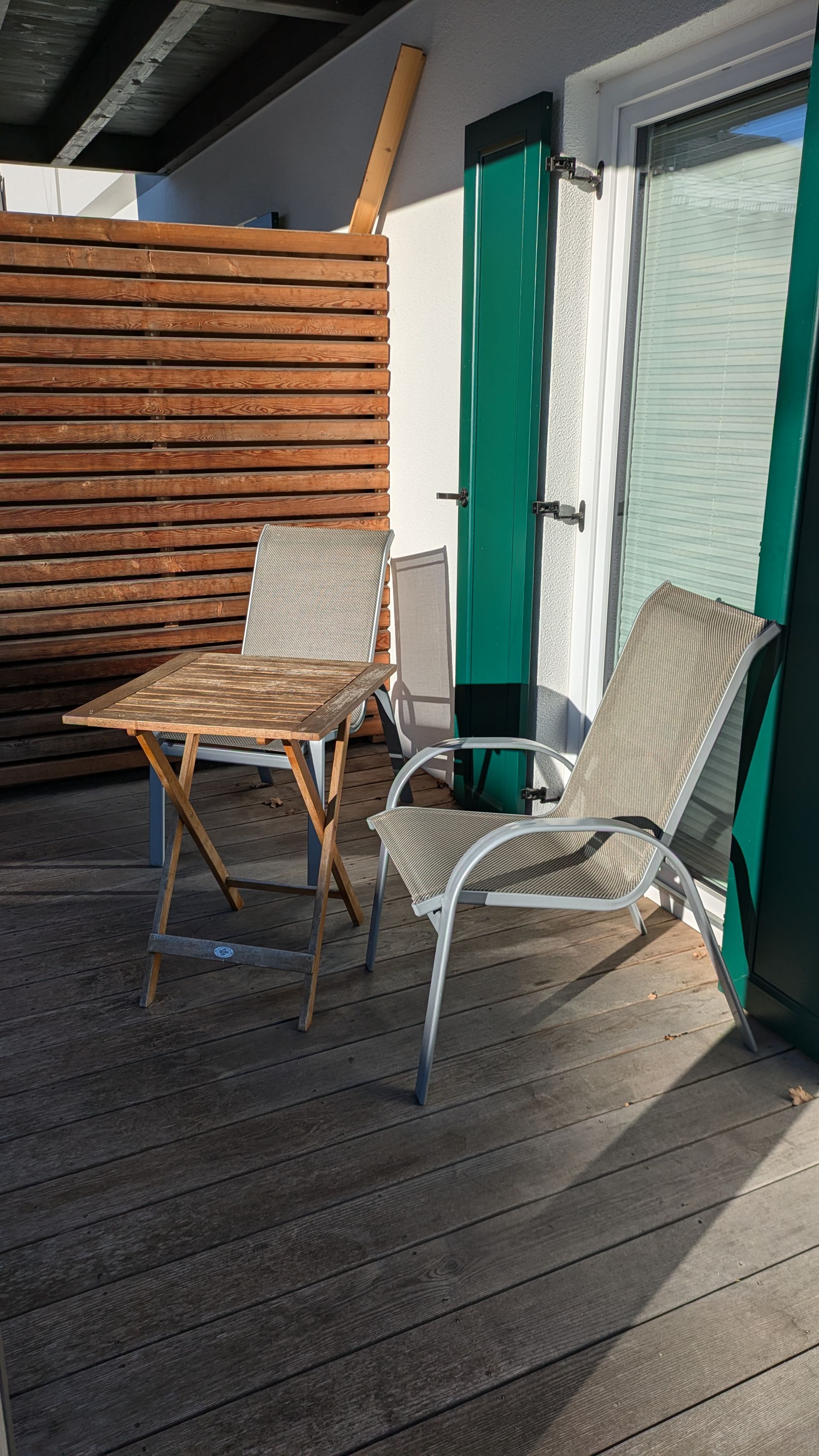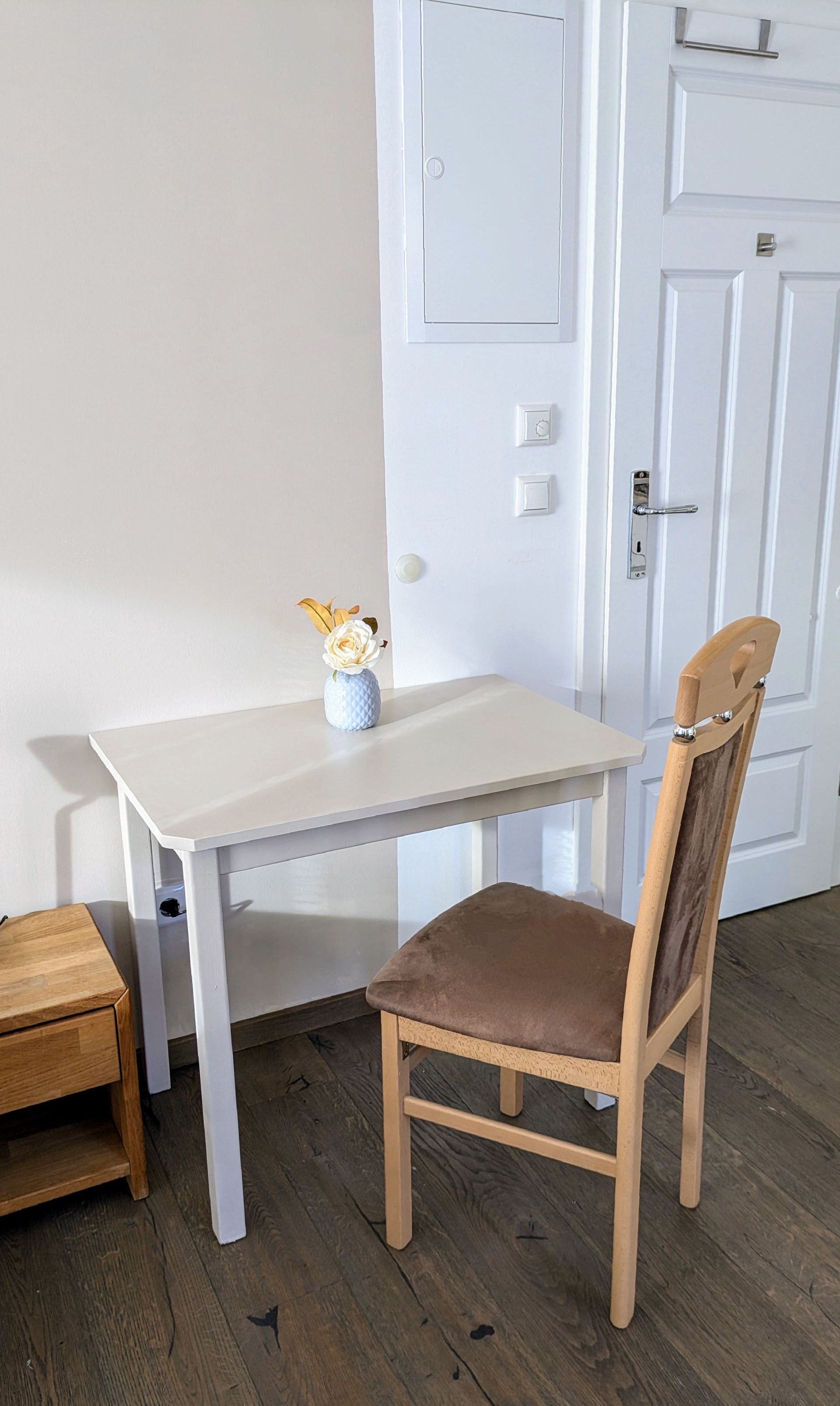 An einem kleinen Tisch mit 2 Stühlen kannst du deinen Kaffee oder dein Essen genießen. Auch im Außenbereich steht dir ein Tisch mit Stühlen bereit